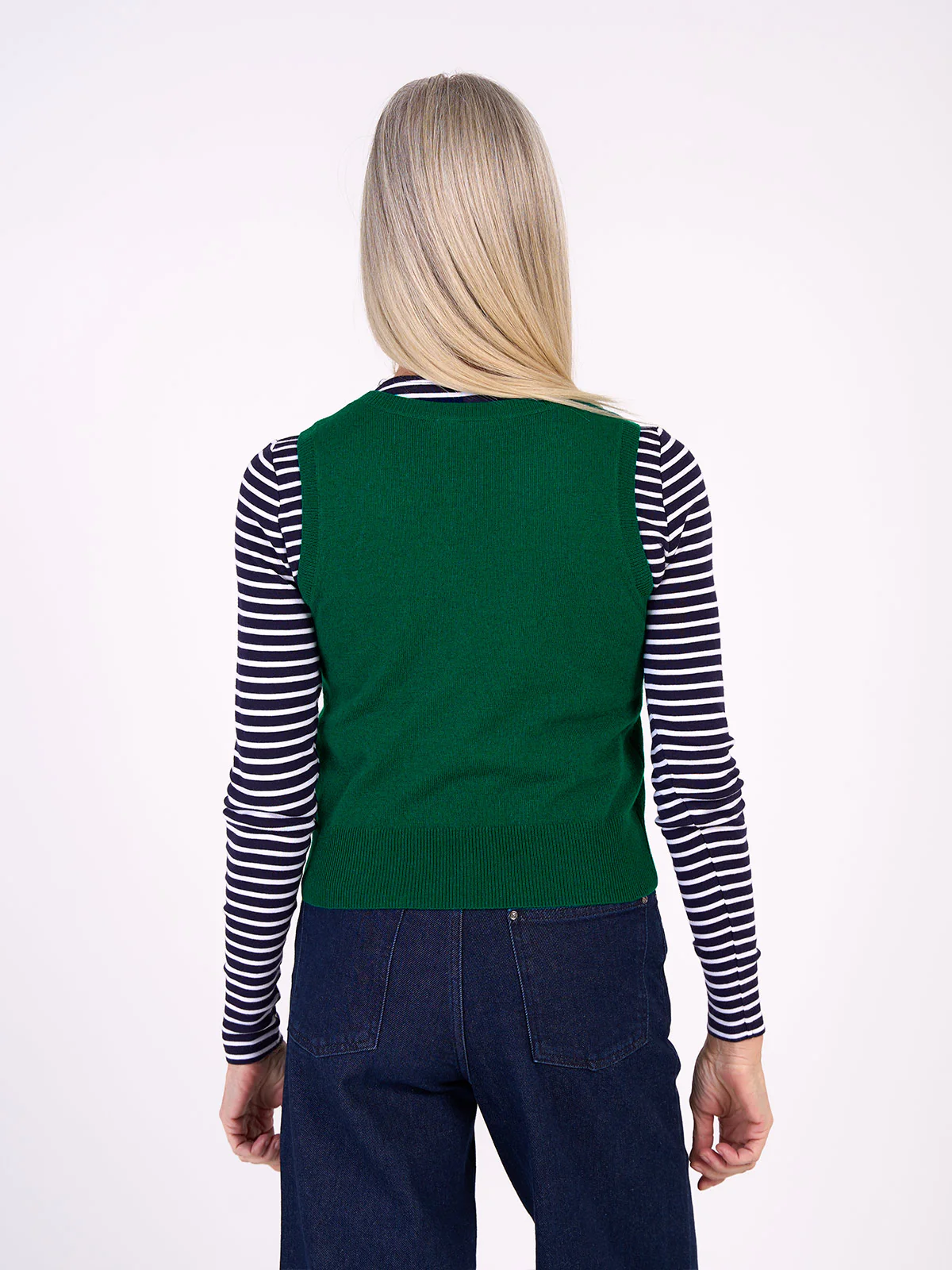 This sleeveless tank top features a classic crew neckline and rib detailing at the hem and neck. Knitted from 100% merino wool.