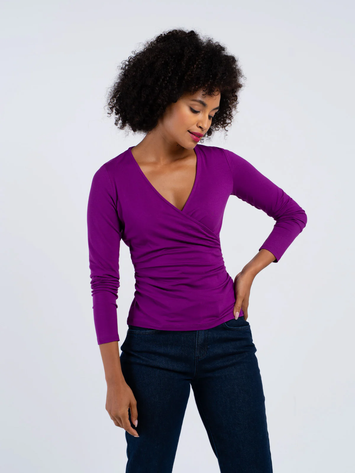 This fitted long-sleeved top is designed with a faux crossover front and subtle side ruching. Crafted from luxuriously soft viscose.