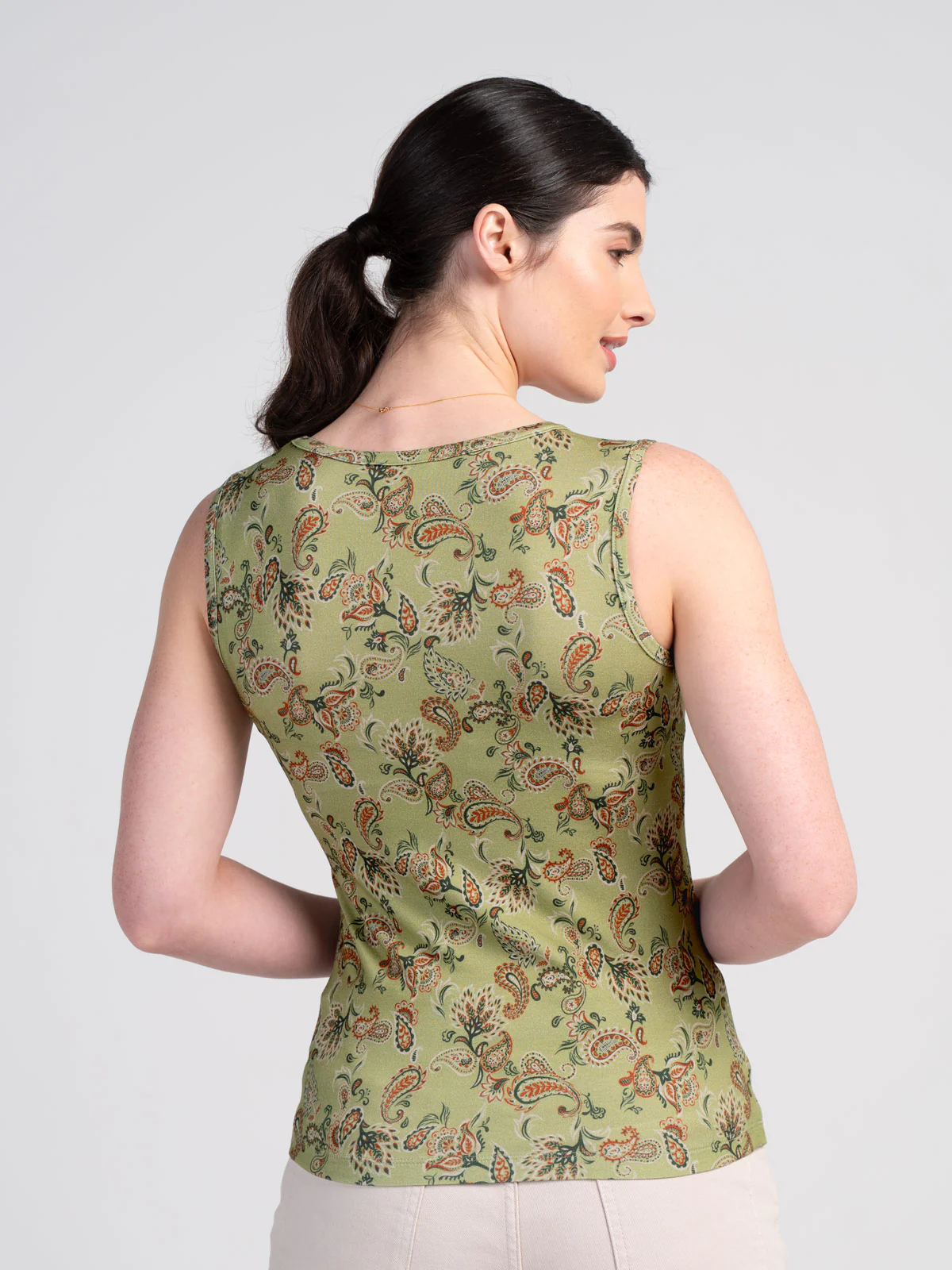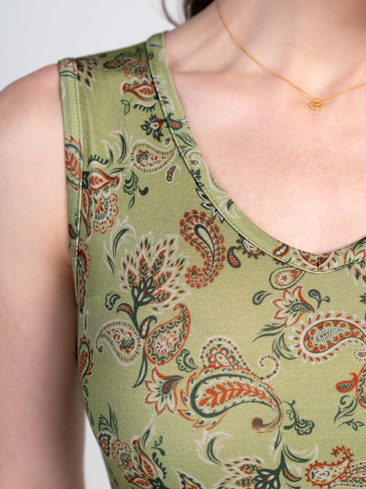 This sleeveless V-neck top is cut in a neat, fitted shape, featuring a small-scale paisley print.