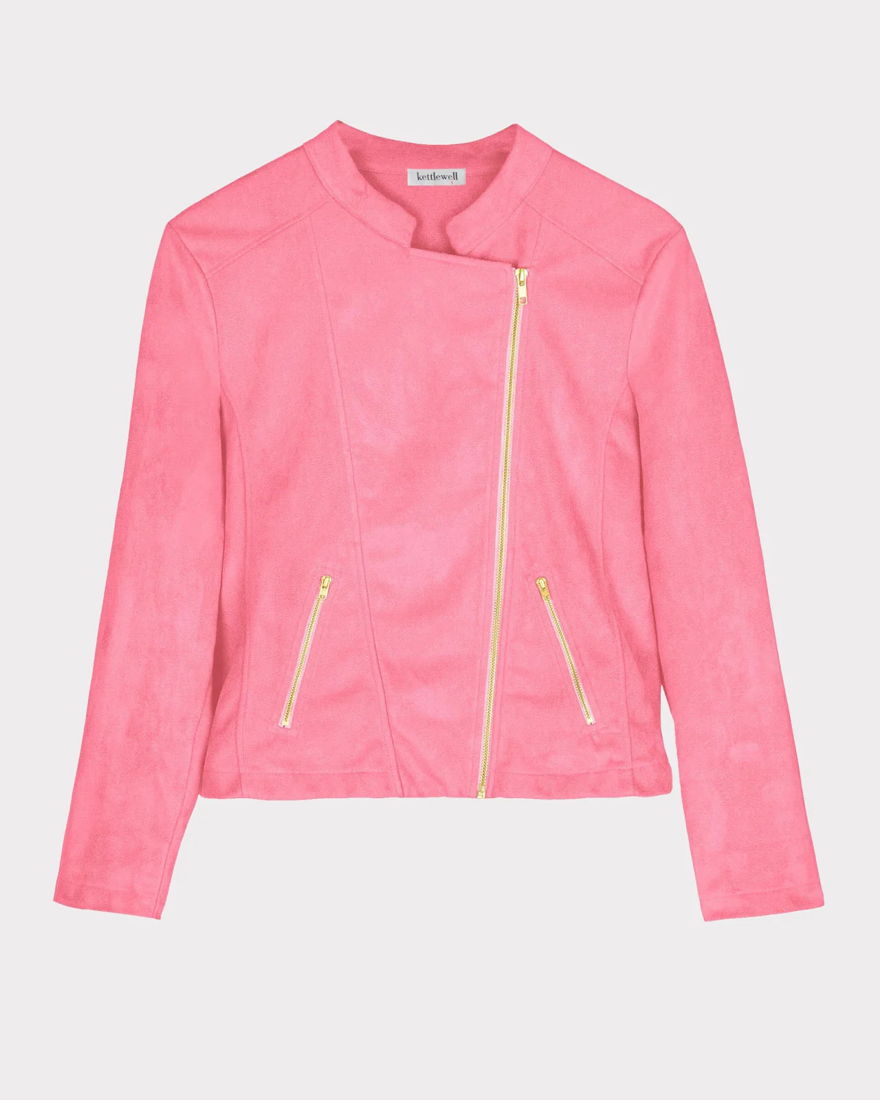 This best selling cropped biker style jacket is made in a soft faux suede, and features an asymmetric full metal zip front fastening and zip pockets. It is unlined and is complete with a short collar stand neckline.